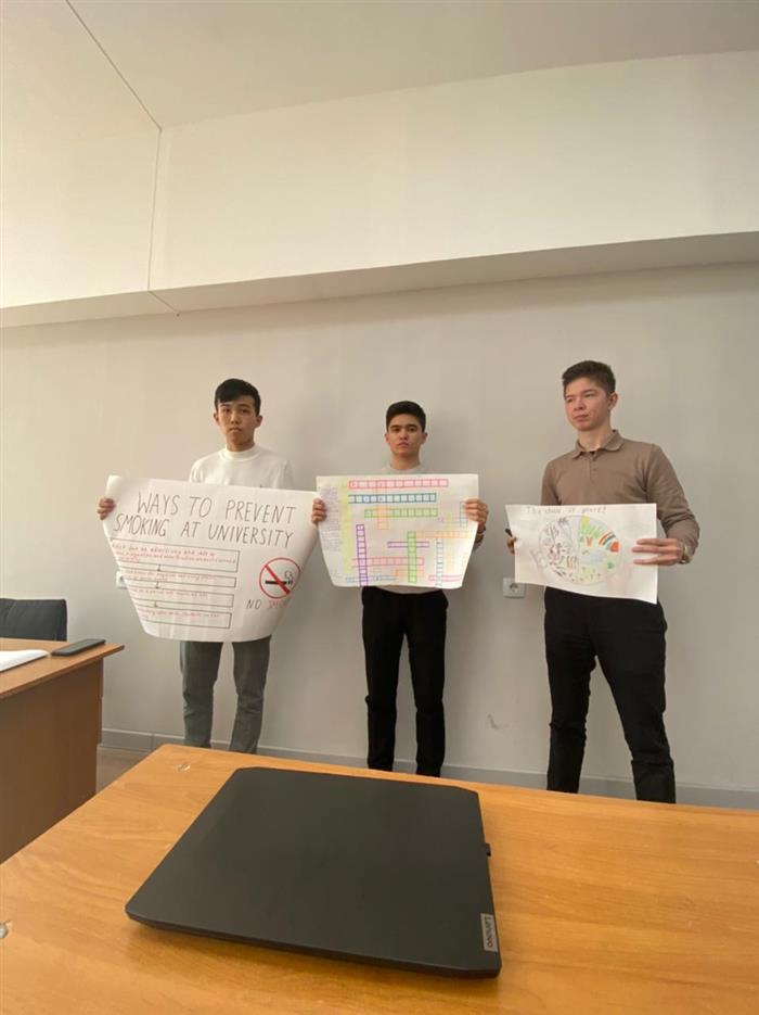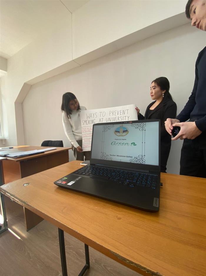 Cтарший преподаватель английского языка Г.А. Мусанова открыла мероприятие привественными словами. После привтественной речи слово было преодставлено Кудебаеву Досболу, студенту первого курса юридического факультета. Тема его доклада была «Экологические проблемы внутри Университета и на территории Республики Казахстан». Студенты Аукен Бауржан, Исмагулова Елмира, и Ниязбек Ардак выступили с докладами по актуальным экологическим проблемам. Кроме того, студенты Кишкенбай Аскар, Нургалиев Нургиса и Каракулов Серик подняли вопрос о вреде курения и предложили пути решения этой проблемы через свои проекты. В конце меропрятии студенты задавали друг другу вопросы и находили ответы на слова, связанные с темой экологии в кроссворде. Студенты, которые нашли правильный ответ и объяснили перевод и определение английских слов по экологии, были награждены призами. Воспитательный урок завершился докладом о значении эмблемы Зеленого Кампуса. Доклад был подготовлен Капашовым Алиханом.