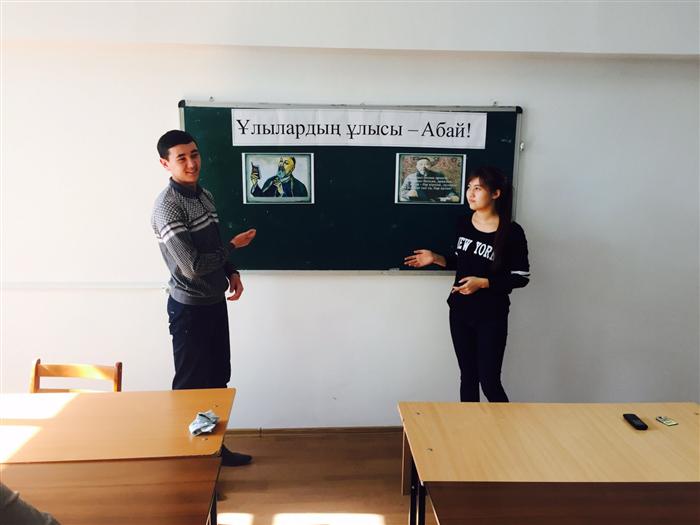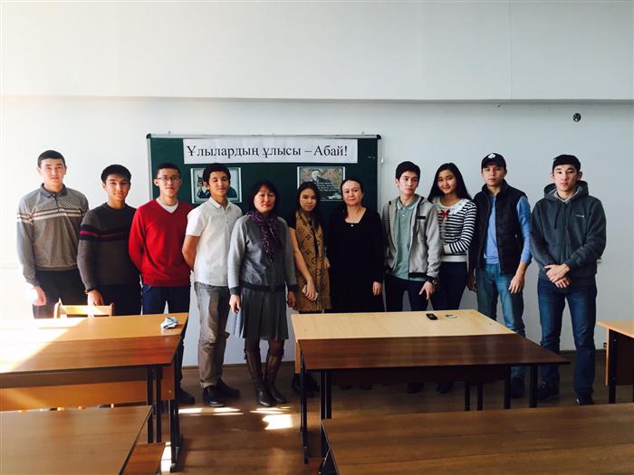 В рамках проекта «100 книг» студенты 1-го курса юридических факультетов провели поэтический вечер "Слова назидания Абая" 5. 11.2015. Цель мероприятия: ознакомление с произведениями Абая, чьи произведения являются примером для студентов, которая учит уважать и имеет больше воспитательные и образовательные слова . Слова назидания Абая Кунанбаева имеет смысл глубокого понимания смысла слов, понимание духовного образования.