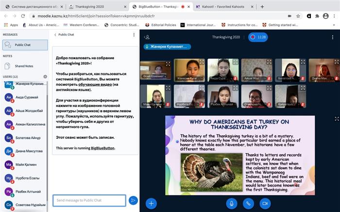 3 декабря 2020 г. доцент кафедры иностранных языков А.К. Шаяхмет провела воспитательно-образовательное мероприятие «День благодарения» в рамках программы “Айналаңды нұрландыр!”. Само мероприятие прошло на платформе ‘BigBlueButton’ ‘Moodle’, а с применением современных обучающих технологий была организована познавательно-обучающая игра ‘Kahoot!’ «День благодарения в странах мира». Студенты второго курса факультета востоковедения - Жанерке Кулахметова, Диана Максутова, Мадина Кайраткызы, Нурайым Советова, Айнур Болатова, Алтынай Разбек, Нурбота Есалы, Аида Сурамай, Майя Калмен - говорили и презентовали на английском языке. Победители ‘Kahoot!’ - Айша Жолдасбек - 1-место, Айнур Болатова - 2-место, Нурайым Советова - 3-место, а также все участники продемонстрировали свои культурологические познания. Кроме того, мероприятие позволило проявить нам навыки сотрудничества, кооперации и взаимопомощи в наше непростое время пандемии.