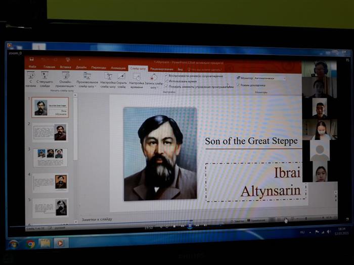12 марта 2021г. в 17.00 часов старшие преподаватели кафедры иностранных языков Тлеугабылова З.А., Махажанова Л.М., Бекалаева А.О. совместно со старшим преподавателем кафедры Иностранной филологии и переводческого дела Таразского регионального университета им. М.Х. Дулати Есеевой А.Б., провели on line литературный вечер «Великий учитель степи», посвященный 180-летию Ыбрая Алтынсарина.
