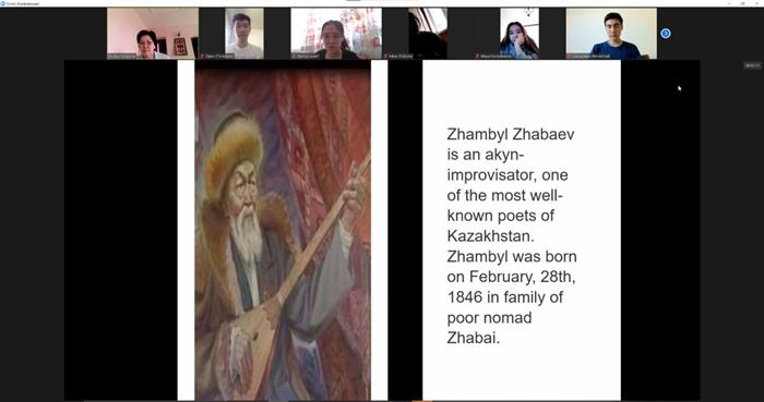 Студенты двух вузов выступили с презентациями о жизни великого казахстанского писателя Жамбыла Жабаева, прочитали стихи поэта «Менің – пірім Сүйінбай, сөз сөйлемен сыйынбай» и др. стихи. Участники обсудили отношения и уважение между Жамбылом Жабаевым и великим киргизским поэтом Токтагулом Сатылгановым. Студенты смотрели Дом-музей Жамбыла на YouTube.