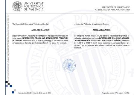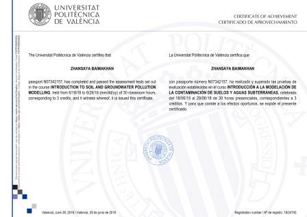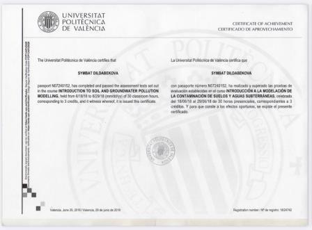 | Дилдабекова Сымбат Нұралықызы | Введение в моделирование загрязнения почв и подземных вод | 18.06.2018 –29.06.2018 | Испания, Валенсия | ![]() |