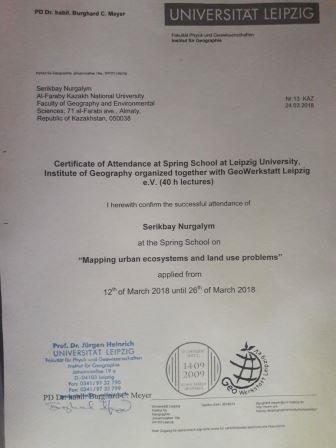 | Серікбай Нұрғалым Тәжібайұлы | Картирование городских экосистем и проблемы землепользования | 12.03.2018 –26.03.2018 | Германия, Лейпциг | |