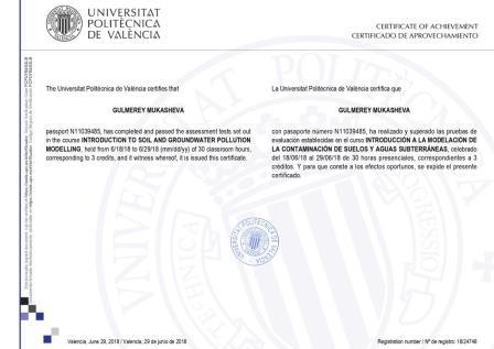 | Мукашева Гүлмерей Жанатқызы | Введение в моделирование загрязнения почв и подземных вод | 18.06.2018 –29.06.2018 | Испания, Валенсия | ![]() |