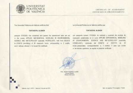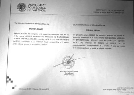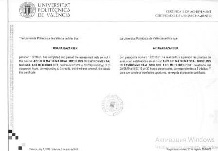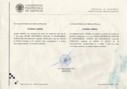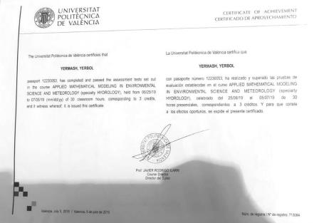 | Ермаш Ербол | Прикладное математическое моделирование в экологии и метеорологии | 25.06.2019 – 05.07.2019 | Испания, Валенсия | |