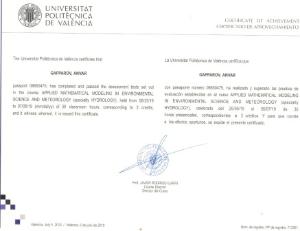 | Гаппаров Анвар | Прикладное математическое моделирование в экологии и метеорологии | 25.06.2019 – 05.07.2019 | Испания, Валенсия | |