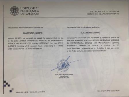 | Даулетияров Куандык | Прикладное математическое моделирование в экологии и метеорологии | 25.06.2019 – 05.07.2019 | Испания, Валенсия | |