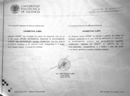 | Ахметова С.Т. | Оценка влияния изменения климата на основе гидрологических характеристик на водные объекты | 15.03.2019-30.04.2019 | Испания, Валенсия | |