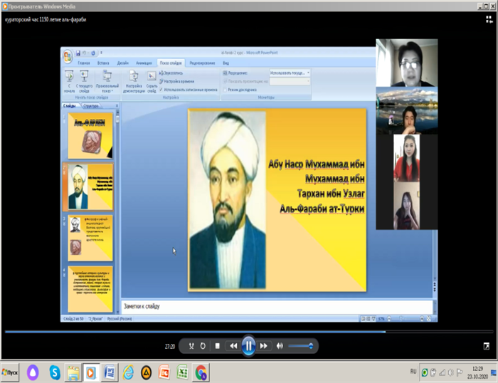 Двадцать третьего октября текущего года 23.10.2020 со студентами группы «мировая экономика» факультета международных отношений“Казахского национального университета имени Аль-Фараби” состоялся онлайн-круглый стол на платформе ZOOM на тему «Аль-Фараби-духовный учитель Великой степи». Мероприятие начался с доклада эдвайзера группы Смагуловой А. С. об Аль-Фараби. Следующим выступлением круглого стола стала книга студентки группы ЖумагалиевойЛаулы "Аль-Фараби-гений вселенной!"продолжилась презентацией, подготовленной на тему.В ходе выступления был подробно описан и проанализирован наш предок Аль-Фараби.Далее были представлены эссе и размышления КабдуловаАдилета и Садыкова Жоламана на русском языке. Продолжением мероприятия стало презентация АманбайМуслимы и Жумабаевой Дианы на английском языке, посвященными жизненному пути и творчеству Аль-Фараби. Кульминацией этого дня стал дух нашего пра-деда Аль-Фараби, его нравственности и пройденного пути и его прославлению. В завершение выступления студенты группы выразили уверенность в том, что они будут продолжать свой путь аль-Фараби, заявив, что довольны тем, что учатся в вузе, названном в честь такого Великого человека. Аль-Фараби - как личность гениальный, мыслитель, знающий тайны мира, вкладывающий труд в каждую отрасль науки! Каждый гражданин нашей страны, никогда не должен забывать о великой личности, должен получать из его произведений знания, необходимые для жизни, и постоянно помнить о них!