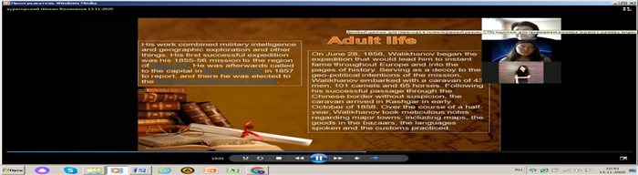 Круглый стол начался с доклада эдвайзера группы Смагуловой А. С. и продолжился презентацией, подготовленной Жумагалиевой Лаулой о Чокане Чингизовиче Валиханове на казахском языке.Далее на русском языке Берденова Дарина поделилась множеством подробностей. Круглый стол,как всегда, прошел на трех языках.На английском языке Жумабаева Диана выступила с докладом, в котором отразила труд и жизненный путь Шокана.В ходе онлайн-круглого стола было рассказано о героических заслугах казахского общества,оставивших неизгладимый след в короткой жизни Шокана.