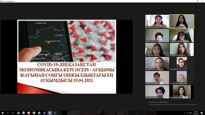 19 апреля 2021 года со студентами 2 курса специальности «Мировая экономика» факультета международных отношений Казахского национального университета имени Аль-Фараби состоялся онлайн круглый стол на тему «Негативное влияние COVID-19 на экономику Казахстана - самый крупный за последнее десятилетие ».