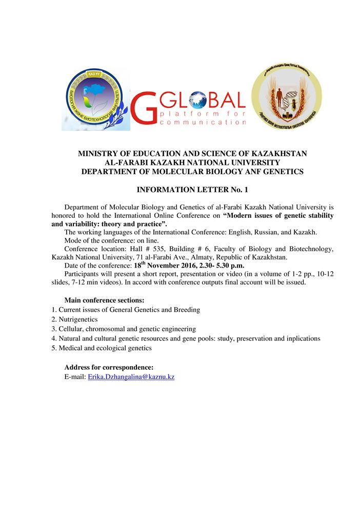 Кафедра молекулярной биологии и генетики факультета биологии и биотехнологии Казахского Национального Университета имени аль-Фараби рада пригласить всех желающих посетить он-лайн конференцию G-Global, посвященную поблемам современной генетики.