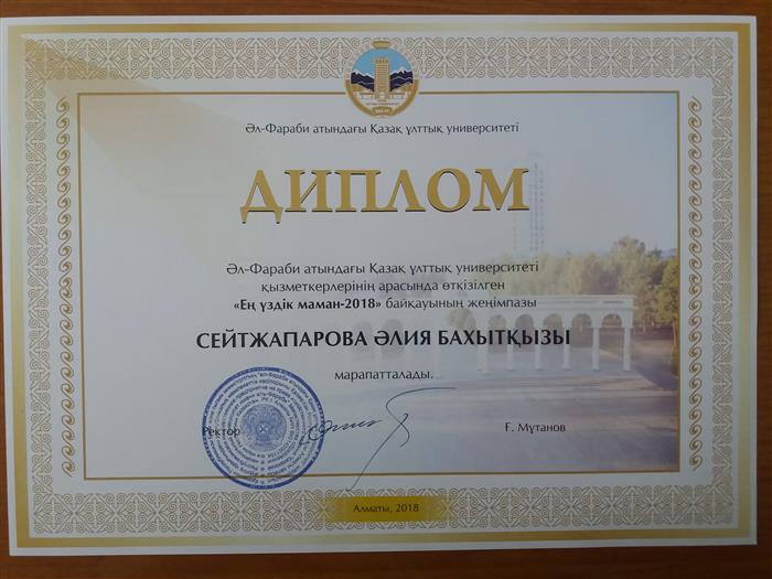 Специалист кафедры аналитической, коллоидной химии и технологии редких элементов факультета химии и химической технологии редких элементов КазНУ имени аль-Фараби Сейтжапарова Алия Бахытовна стала обладательницой титула «Ең үздік маман - 2018», организованной среди сотрудников КазНУ им. аль-Фараби. Алия Бахытовна –профессиональный сотрудник нашей кафедры с большим опытом. Славится авторитетом среди сотрудников факультета и студентов. Студенты очень любят ее за доброту и отзывчивость. Сотрудники кафедры поздравляют Сейтжапарову А.Б. заслуженным титулом «Ең үздік маман – 2018» и искренне радуются за ее победу!