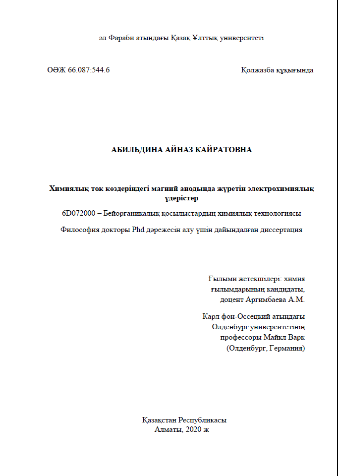Докторантка Абильдина А.К. защитила PhD диссертацию по специальности «6D0720-Химическая технология неорганических веществ» по теме «Электрохимические процессы на магниевом аноде в химических источниках тока».