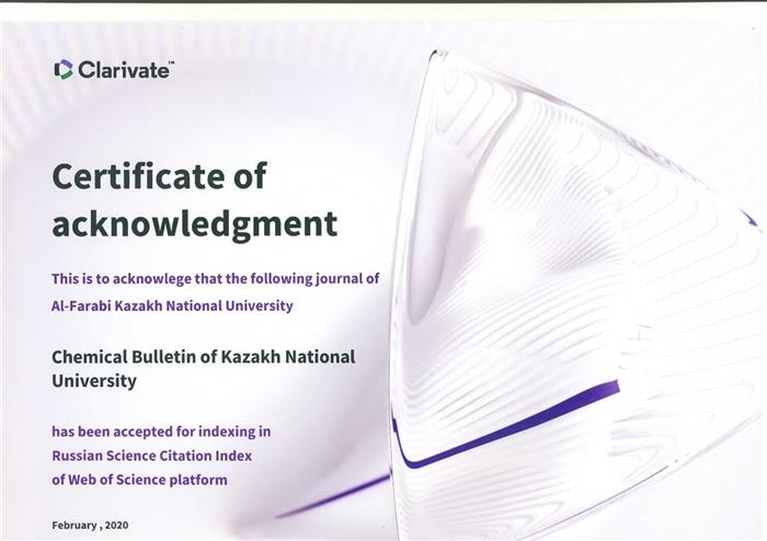 Химическая серия Вестника КазНУ имени аль-Фараби была включена в индекс цитирования в «Russian Science Citation Index» на платформе Web of Science.