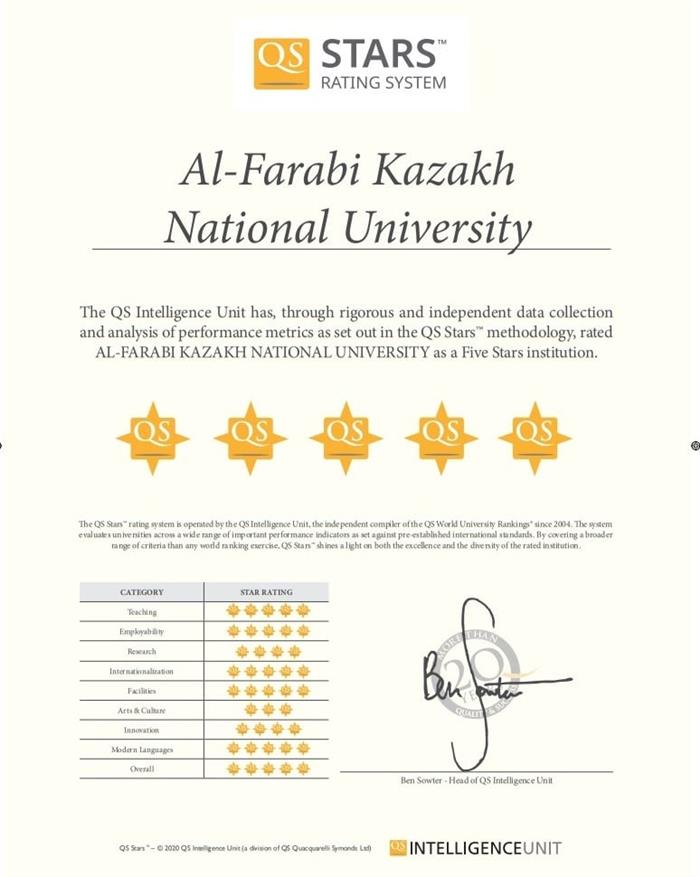 Казахский национальный университет имени аль-Фараби удостоился высокой оценки, и стал первым и единственным вузом в Центрально-Азиатском регионе получившим «Пять звезд» превосходства в международном рейтинге «QS Stars Rating System».