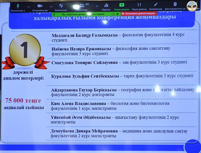 В завершение встречи прошла церемония награждения победителей международной научной конференции студентов и молодых ученых «Фараби әлемі», конкурсов инновационных проектов студенческих бизнес-инкубаторов и «Лучший молодой ученый».