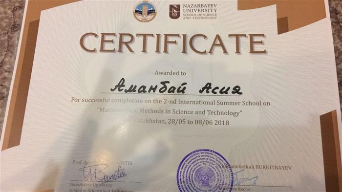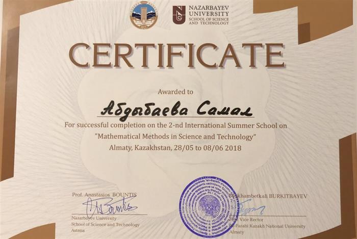 Выданы сертификаты за успешное завершение 2-й Международной летней школы “Mathematical methods in science and Technology” магистрантам первого года обучения специальности МКМ: Абдыбаевой С., Аманбай А., Винниковой К., Мендыханкызы П.