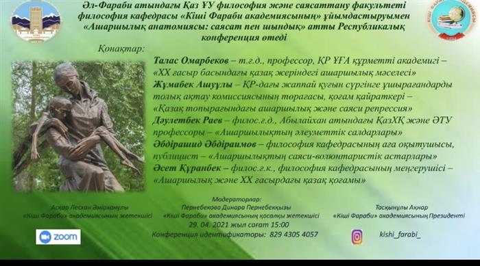 29 апреля была проведена республиканская конференция «Голод в Казахстане: политика и правда». В рамках конференции были прослушаны доклады гостей и участников: известный историк, доктор исторических наук, профессор, почетный академик НАН РК – Талас Омарбеков; член комиссии по полной реабилитации жертв массовых репрессий в Казахстане, общественный деятель – Жумабек Ашуулы; д.филос.н., профессор КазУМОиМЯ имени Абылай хана – Раев Д.С.;, ст. преподаватель кафедры философии КазНУ, публицист – Абдираимов А.Б.; заведующий кафедрой философии КазНУ, к.филос.н. – Куранбек А.А. Участники конференции решили собрать воспоминания о голоде в Казахстане и издать сборник воспоминаний. Участники и студенты с интересом слушали доклады и задавали много вопросов, на которые были получены конкретные ответы.