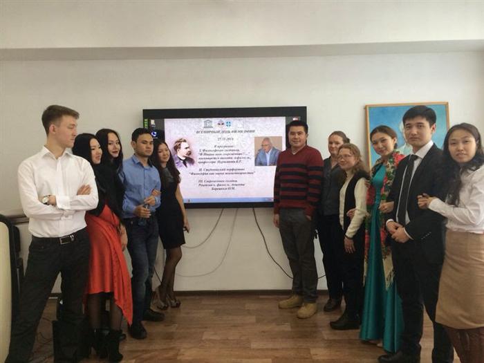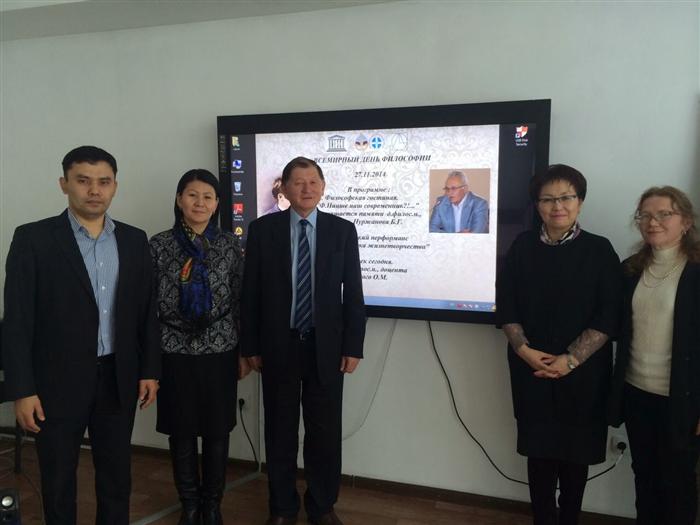 27 ноября 2014 года на факультете философии и политологии отмечался Всемирный День философии. Всемирный День философии был посвящен 170-летию со дня рождения великого мыслителя Фридриха Ницше и светлой памяти основоположника культурологии и первого постмодерниста в Казахстане профессора Бекета Галимжановича Нуржанова. В мероприятии приняли участие декан факультета философии и политологии профессор Масалимова А.Р., директор Центра аль-Фараби профессор Алтаев Ж.А., доценты кафедры философии Борецкий О.М., Амиркулова Ж.А., Лифанова Т.Ю., бакалавры факультетов философии и политологии, востоковедения, факультета международных отношений.