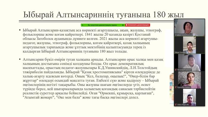 27 марта 2021 года, по случаю 180-летия со дня рождения выдающегося казахского педагога - просветителя, писателя, этнографа Ибрая Алтынсарина состоялось большое онлайн-мероприятие на казахском и английском языках на тему “ Ибрай Алтынсарин – первый учитель казахской степи”, организованное старшими преподавателями кафедры иностранных языков факультета филологии и мировых языков: Дуйсенбаевой Ш. С. и Акыловой Г. С.