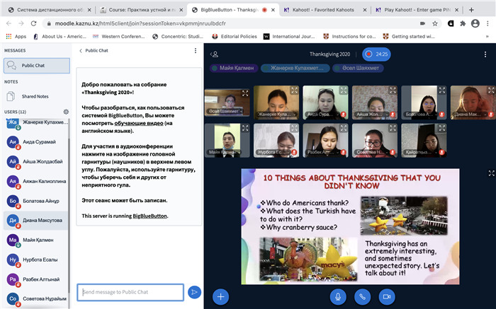 3 декабря 2020 г. доцент кафедры иностранных языков А.К. Шаяхмет провела воспитательно-образовательное мероприятие «День благодарения» в рамках программы “Айналаңды нұрландыр!”. Само мероприятие прошло на платформе ‘BigBlueButton’ ‘Moodle’, а с применением современных обучающих технологий была организована познавательно-обучающая игра ‘Kahoot!’ «День благодарения в странах мира». Студенты второго курса факультета востоковедения - Жанерке Кулахметова, Диана Максутова, Мадина Кайраткызы, Нурайым Советова, Айнур Болатова, Алтынай Разбек, Нурбота Есалы, Аида Сурамай, Майя Калмен - говорили и презентовали на английском языке. Победители ‘Kahoot!’ - Айша Жолдасбек - 1-место, Айнур Болатова - 2-место, Нурайым Советова - 3-место, а также все участники продемонстрировали свои культурологические познания. Кроме того, мероприятие позволило проявить нам навыки сотрудничества, кооперации и взаимопомощи в наше непростое время пандемии.