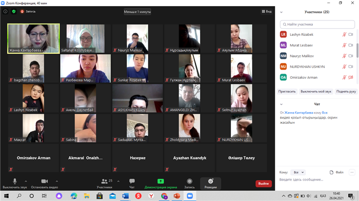 26 апреля 2021 года старшим преподавателем кафедры религиоведения и культурологии факультета философии и политологии Кантарбаевой Ж. У. и магистрантом 1 курса специальности «Религиозная идентичность в конфликтологии» Койшыбаевой С. С. в рамках педагогической практики со студентами 2 курса специальности «Религиоведение» на платформе ZOOM был проведен открытый урок на тему «Религия и социальная стратификация».