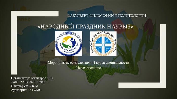 22 марта в рамках проекта «Айналаңды нұрландыр» кафедрой религиоведения и культурологии факультета философии и политологии, с участием студентов-исламоведов 4 курса была прочитана лекция на тему «Национальный праздник Наурыз».