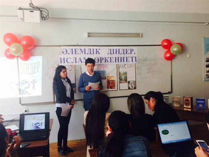 Студенты: Нурланова Сания,Окенова Гулсана,Рахманбердиева Акжан,Шуюншалиева Акнур подготовили свои доклады на тему "Буддизм,Христиан,Ислам", прочитали наизусть стихотворение М.Макатаева "Всем тем,приверженцев ислама".Также было показано видео на тему "Религиозная грамотность и экстремизм".