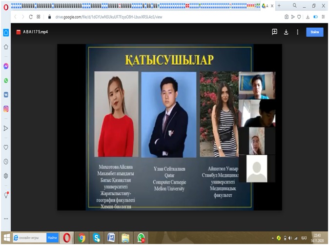 Computer Carnegie Mellon University), наш земляк Улан Сейткалиев прочитал стих Абая «Зима» на английском языке, Забиров Данияр, студент 2 курса специальности «Философия», читал на татарском, а Дюсен Меруерт, студент-религиовед, читал на китайском языках. В мероприятии также приняла участие студентка Стамбульского медицинского университета Айшегюл Уакыр, которая увлекается творчеством Абая. Во второй части проверяли уровень знаний, задавая вопросы о жизни Абая и его творчестве, задания по словам назидания, и его поэзии. Третья часть мероприятия была посвящена загадкам и ребусам по твореству Абая. Это мероприятие, посвященное наследию великого мыслителя Абая было очень интересным и свидетельствовало о том, что наследие Хакима Абая продолжает находить место в сердцах молодежи и сегодня, и будет иметь продолжение и завтра.