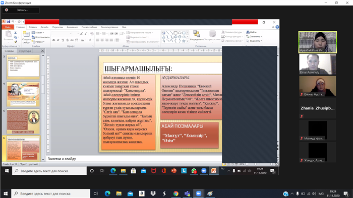 11 ноября 2020 года в рамках проекта «100 книг которые должен прочитать студент КазНУ» куратор-эдвайзер 1 курса специальности исламоведение кафедры религиоведения и культурологии Е. Аскенулы провел онлайн встречу со студентами на тему «Наследие Абая – маяк казахской нации». В ходе встречи студентам была проведена разъяснительная работа о значении стихов и слов назидания мыслителя Абая, роль учения Абая в жизни казахского народа. Студент 1 курса специальности исламоведение Р. Аралбай представил презентацию о творчестве А. Кунанбайулы, а другие студенты высказали свое мнение о произведениях великого поэта. В завершение мероприятия Е. Аскенулы ответил на все вопросы студентов, связанные с творчеством А. Кунанбайулы.