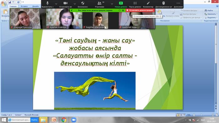 студенты 2-го курса специальности «Религиоведение» организовали на платформе ZOOM, в рамках проекта «В здоровом теле – здоровый дух» состязание на тему «Здоровый образ жизни – залог хорошего здоровья» с участием куратора-эдвайзера Кантарбаевой Ж.У. Студенты отметили важность мер предосторожности в условиях нынешней пандемии и провели викторину. Были интересные головоломки и загадки на поиск ключа к здоровью. В целом мероприятие прошло интересно.