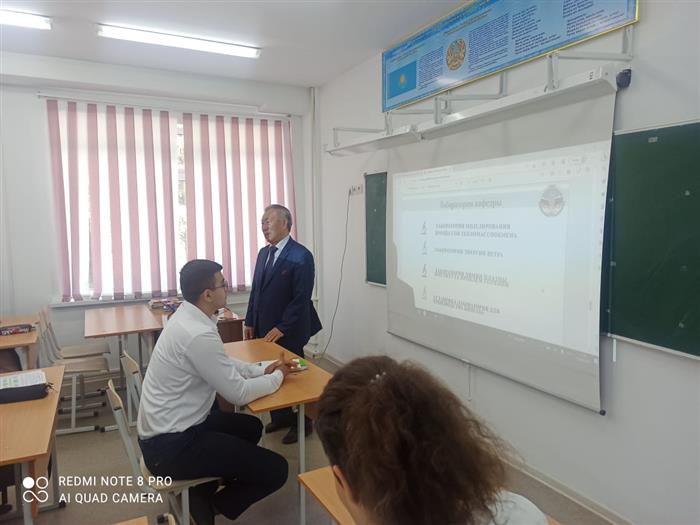 Согласно плана проф-технической орентации школьников доцент кафедры Т.Тусеев 24.04/2023 г. провел встречу со школьниками 11 класса общеобразовательной средней школы №7 города Алматы, расположенной в поселке Алатау Медеуской районы. Школьникам было рассказано о специальностях, по котором ведется подготовка кадров на кафедре, о работадателях, о международных связах кафедры, о двойных дипломах и др. Встреча было полезной для обеих сторон.