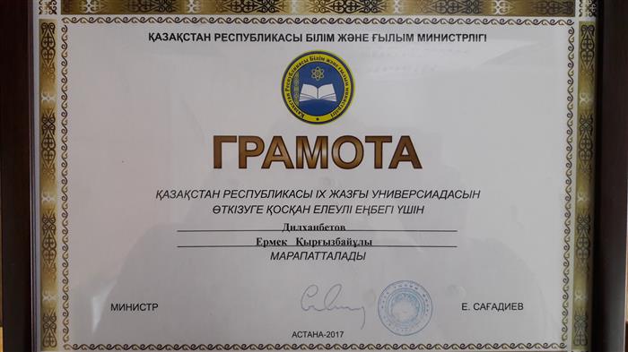 Заведующий кафедрой физического воспитания и спорта Дилмаханбетов Е.К. за вклад в проведении ІХ летней Универсиады РК награжден грамотой Министерста Образования и Науки Республики Казахстан (2017 год) |