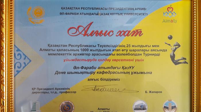 «Алғыс хат» Архива Президента РК коллективу кафедры физического воспитания и спорта за вклад в организации турнира по волейболу (2016 год) |