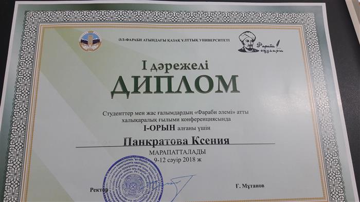 студентка 4 курса кафедры физического воспитания и спорта Панкратова Ксения награждена дипломом І степени за участие в международной научной конференции студентов и молодых ученых «Фараби әлемі». Выступив с докладом на тему: «Прыжки как важнейший компонент достижения высшего спортивного мастерства в фигурном катании на коньках». Научный руководитель доцент, к.п.н.,кафедры физического воспитания и спорта Онгарбаева Дамет Туралбаевна (2018 год) |