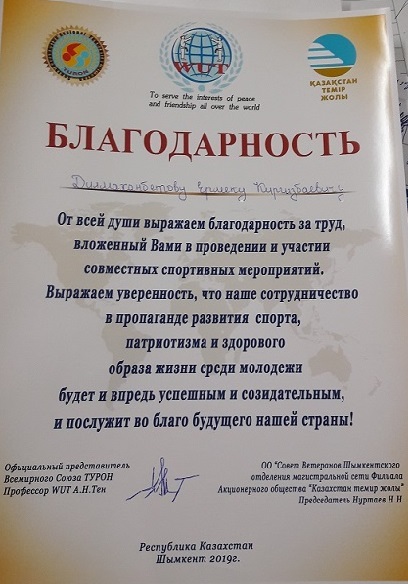 Заведующий кафедрой физического воспитания и спорта Дилмаханбетов Е.К. за совместный вклад по проведении и участии в спортивных мероприятий награжден Благодарственным письмом Всемирного Союза ТУРОН и ОО «Совет Ветеранов Шымкентского отделения магистральной сети Филиала Акционерного общества «Казахстан темир жолы» города Шымкент (2019 год). |
