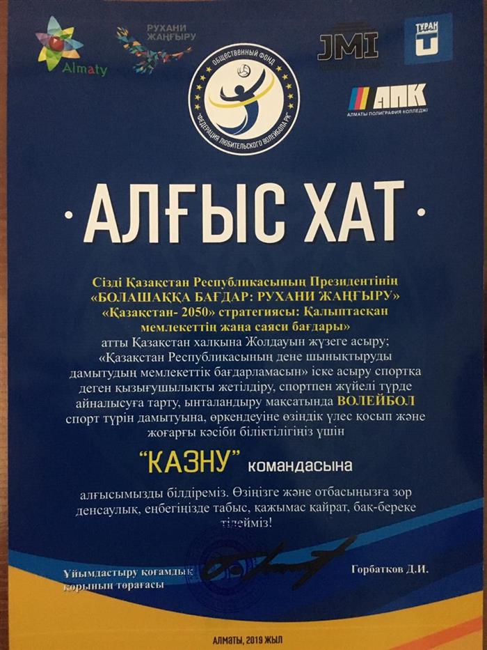 Мужская сборная команда КазНУ им. аль-Фараби по волейболу награждена Алғыс хатом Федераций любительского волейбола города Алматы (2019 год) за большой вклад в участии и пропогаде здорового образа жизни по стратегии Президента РК «Казахстан-2050. БОЛАШАҚҚА БАҒДАР: РУХАНИ ЖАҢҒЫРУ» |