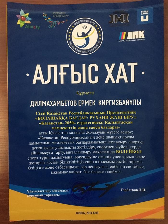 Заведующий кафедрой физического воспитания и спорта Дилмаханбетов Е.К. за большой вклад в развитии и пропаганде волейбола по стратегии Президента РК «Казахстан-2050. БОЛАШАҚҚА БАҒДАР: РУХАНИ ЖАҢҒЫРУ» награжден Алғыс хатом Федераций любительского волейбола РК города Алматы (2019 год) |