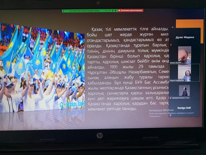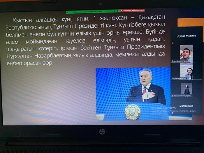 14 декабря на базе кафедры социологии и социальной работы под руководством Омаровой А.Т. студентами 3 курса, 2 группы специальности "Социальная работа" был проведен открытый урок "Елбасы-ел тірегі" на платформе ZOOM. Студенты поделились своими мнениями и остановились на достижениях нашей страны по сей день.