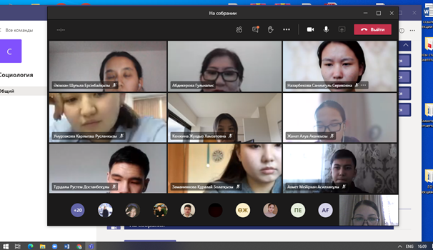 Под руководством профессора кафедры социологии и социальной работы, доктора социологических наук Абдикеровой Гульнафис Орынбасаровны и докторанта кафедры Т. Б. Тауекеловой на платформе МТимс при активном участии студентов 1 курса факультета «География и природопользование» 9.02.2021 года в 16.00 часов.- также прошел час обсуждения в онлайн формате «Роль социологической науки в развитии социальной сферы". Студенты, проанализировавшие проблемы общества в социальной сфере, пути их решения, смогли свободно высказать свое мнение.