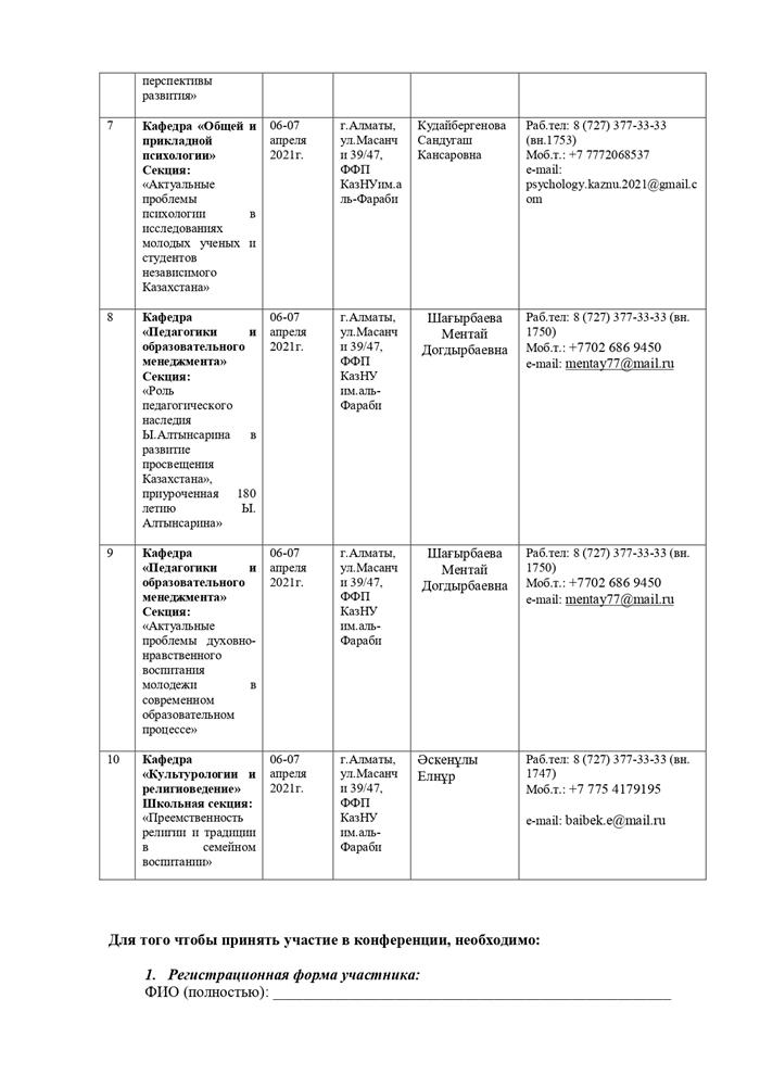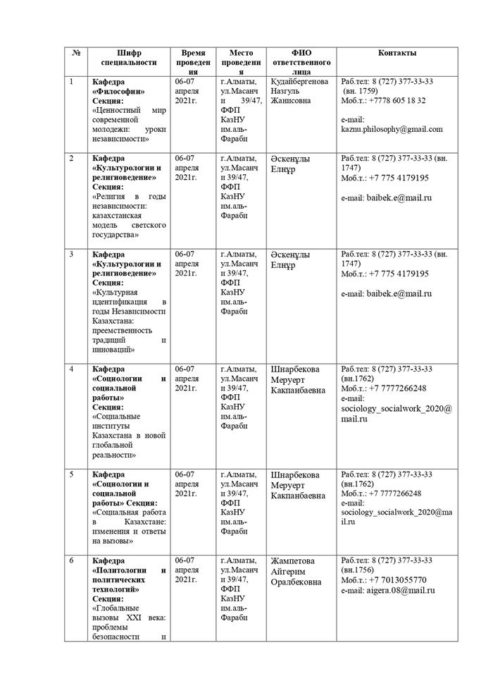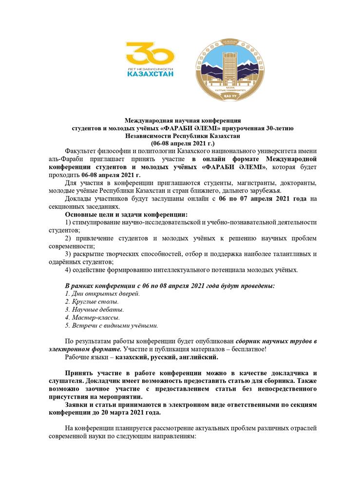 Международная научная конференция студентов и молодых учёных «ФАРАБИ ӘЛЕМІ» приуроченная 30-летию Независимости Республики Казахстан (06-08 апреля 2021 г.)
