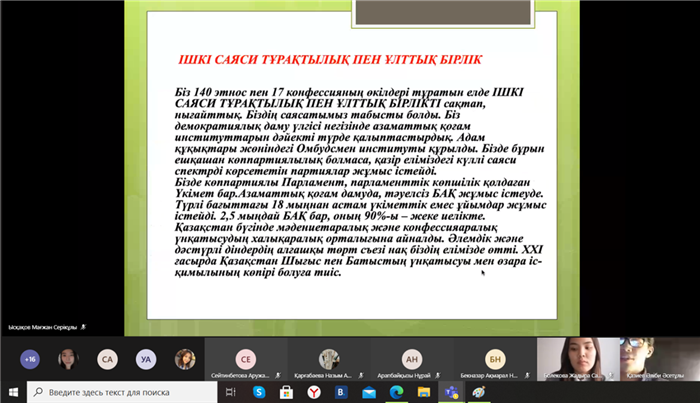 19 февраля 2021 года со студентами 3 курса 18-39, 18-40, 18-41 групп кафедры молекулярной биологии и генетики специальности «Биотехнология» был проведен открытый воспитательный час на уровне факультета на тему: «чтобы жить, нужно уметь меняться». Воспитательный час проводился на канале MC Teams в открытом формате, в честь празднования «30 лет независимости Республики Казахстан», с целью патриотического воспитания студентов. Помимо студентов 3 курса, в мероприятии приняли участие преподаватели кафедр молекулярной биологии и генетики и биотехнологии, а также студенты 2 курса.