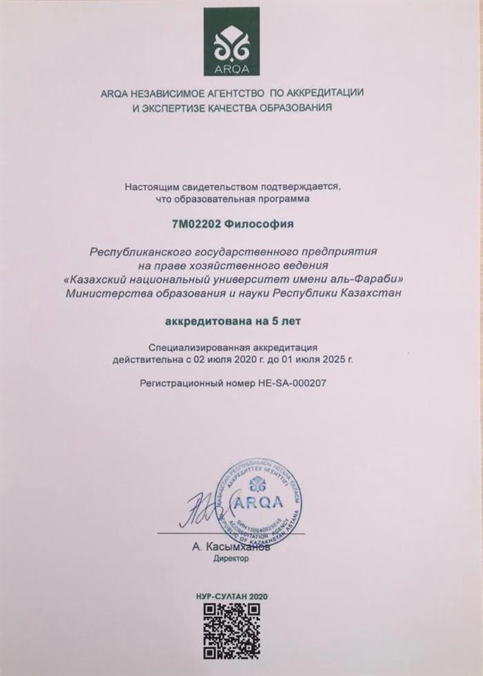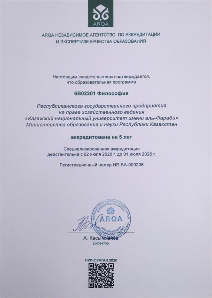 Образовательная программа 6B02201- Философия аккредитована Независимым агентством по аккредитации и экспертизе качества образования (ARQA) на пять лет. Дата выдачи сертификата: 02 июля 2020 года.