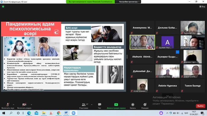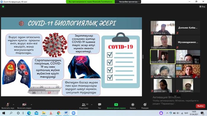Группа 1 успешно защитила тему «Влияние пандемии на психологию человека». Студенты 1-группы смогли максимально раскрыть тему. Участникам была предоставлена подробная информация о вирусе COVID-19 и мерах по его профилактике. В частности, студенты получили новую информацию о биологическом воздействии пандемии на природу, а также о ее плюсах и минусах. В ходе урока были показаны размышления, видеоролики, влияние пандемии коронавируса на человечество и природу было разделено на 5 частей. Это: биологические, социальные, экономические, психологические, экологические.