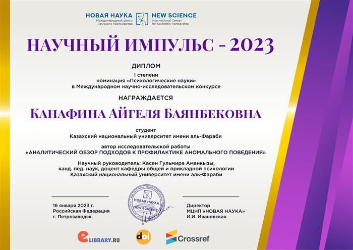 Дипломом 1 степени в номинации «Психологические науки» в Международном научно-исследовательском конкурсе награждается КАНАФИНА АЙГЕЛЯ БАЯНБЕКОВНА, студентка 4 курса Казахского национального университета имени Аль-Фараби, кафедра общей и прикладной психологии.