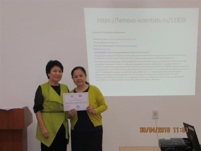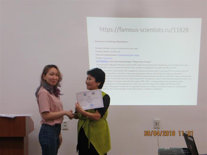 30 апреля 2018г. в рамках проекта "Айналанды нұрландыр" на факультете Философии и политологии состоялся Республиканский круглый стол на тему: «Психологические основы программы духовного возрождения «Рухани жаңғыру»», посвященный памяти профессора С.М. Джакупова.