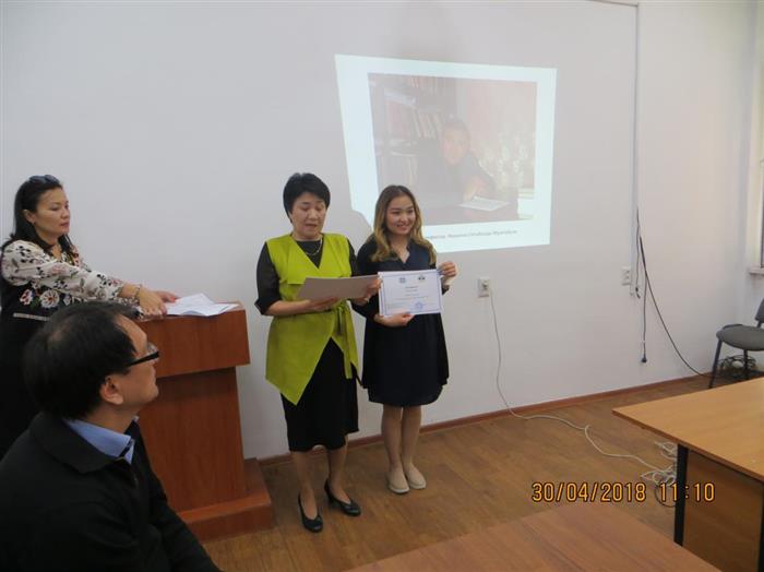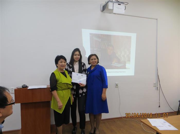 1 место - Сыздыкова Азиза Ханатовна "Психологические особенности перехода казахского языка на латинскую графику" (КазНУ им. аль-Фараби; научный руководитель – д.психол.н., профессор Бердибаева С.К.);