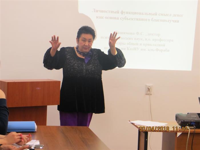 С интересными и содержательными докладами о вкладе профессора Джакупова С.М. в становление и развитие казахстанской экспериментальной этнопсихологии выступили преподаватели кафедры общей и прикладной психологии: доцент Сейтнур Ж.С., магистрант Масимгазиева А., профессор Ташимова Ф.С.