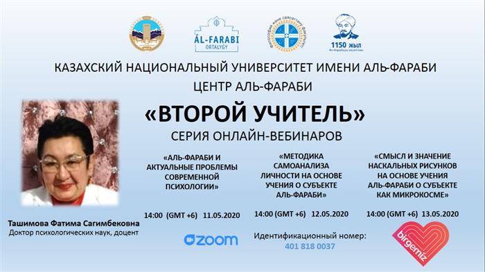 Сегодня, 11 мая 2020 года в 14:00 в рамках серии онлайн-вебинаров «Второй учитель» организованного Казахским национальным университетом имени аль-Фараби и Центром аль-Фараби, посвященных 1150-летию аль-Фараби, доктор психологических наук, доцент кафедры общей и прикладной психологии, факультета философии и политологии КазНУ имени аль-Фараби Ташимова Фатима Сагимбековна провела вебинар на тему: «аль-Фараби и актуальные проблемы современной психологии».
